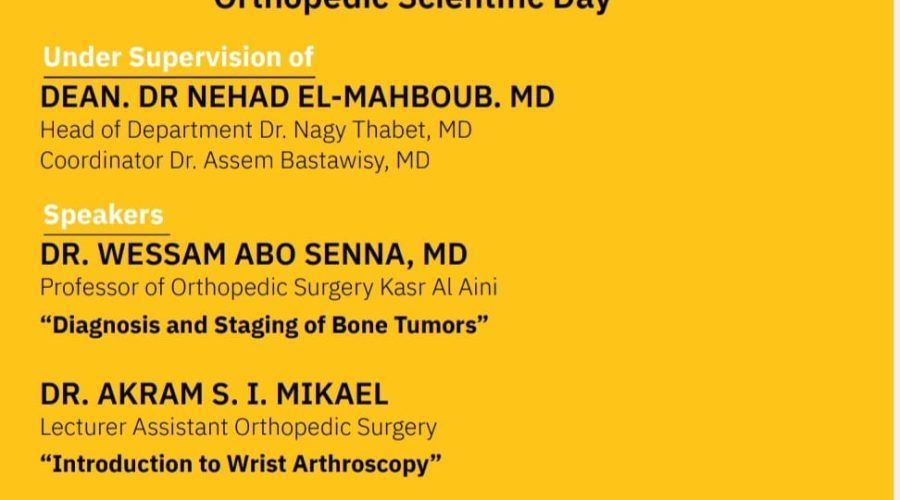 Scientific Day, Sunday 3/19/2023 Hosting Dr. Wissam Abosena, Professor of Orthopedic Surgery at Kasr Al-Aini, his lecture was entitled, “Diagnosis and Staging of Bone Tumors.” The second lecture is by Dr. Akram Sami, Assistant Lecturer in the department, and its title was “Introduction to Wrist Arthroscope”.Read More