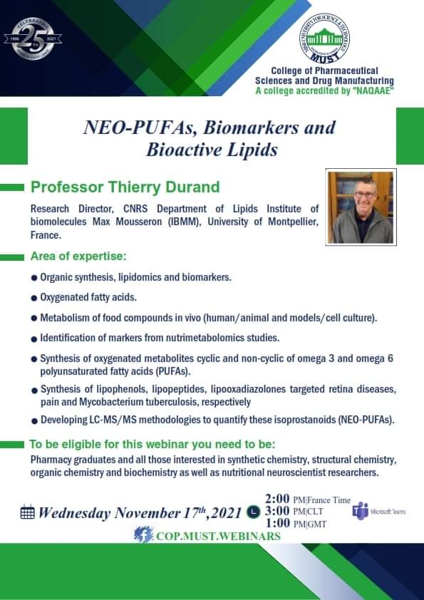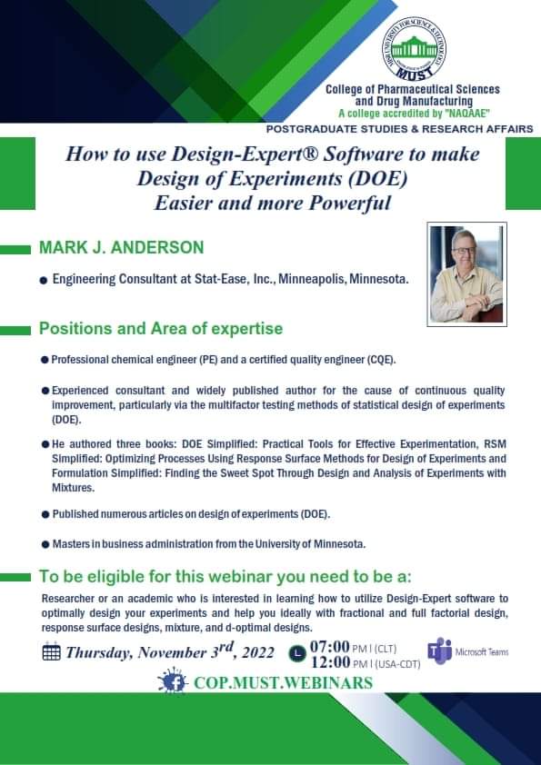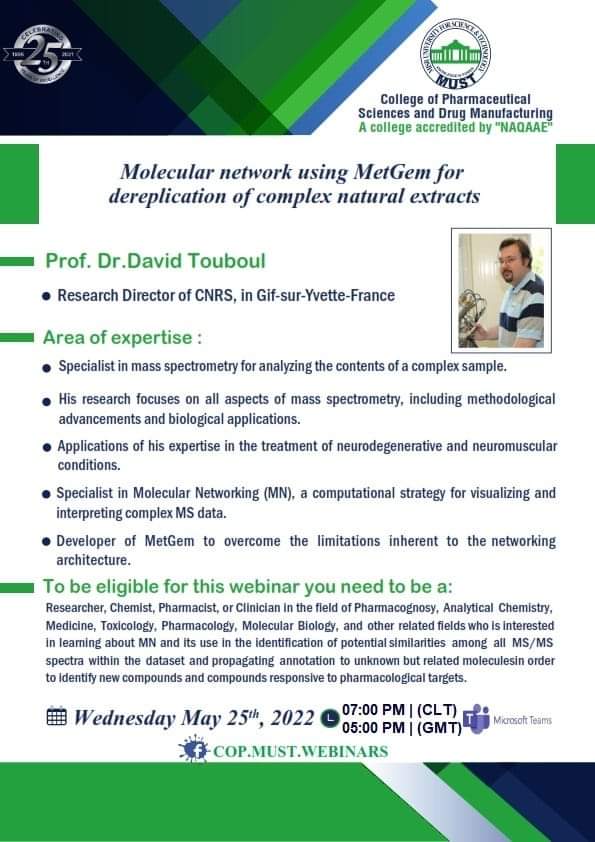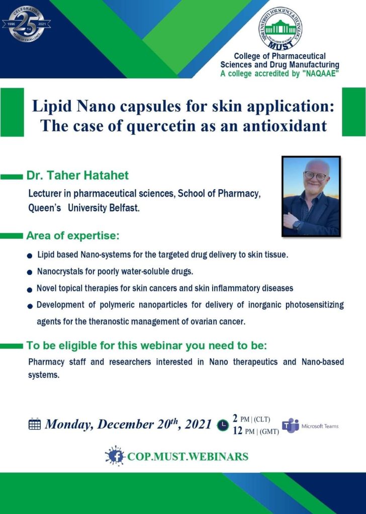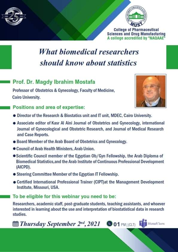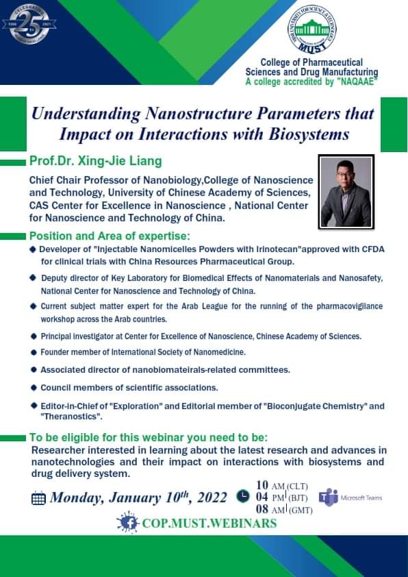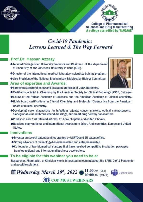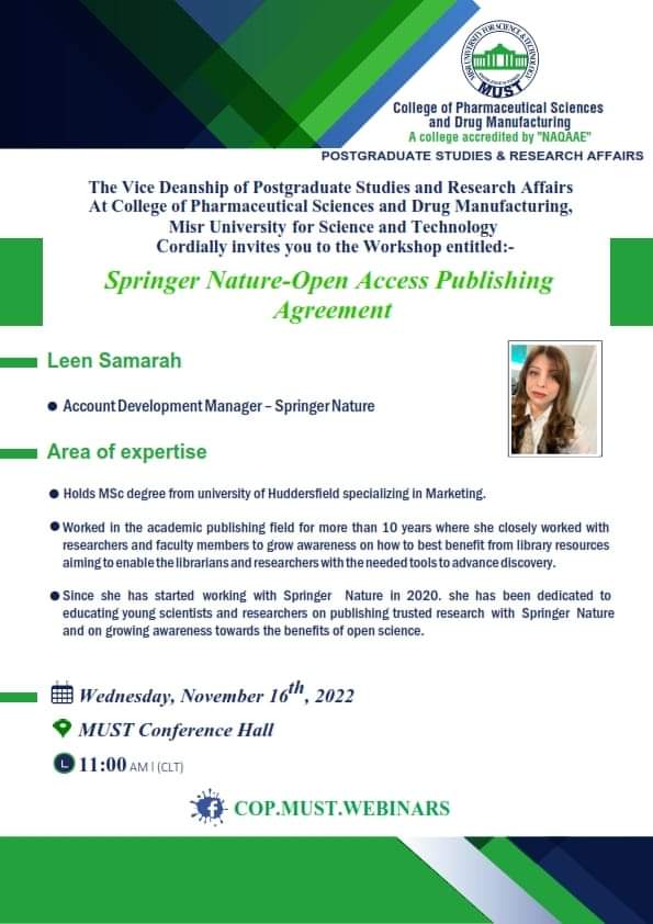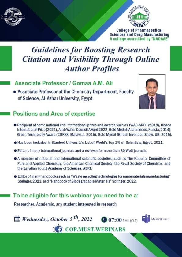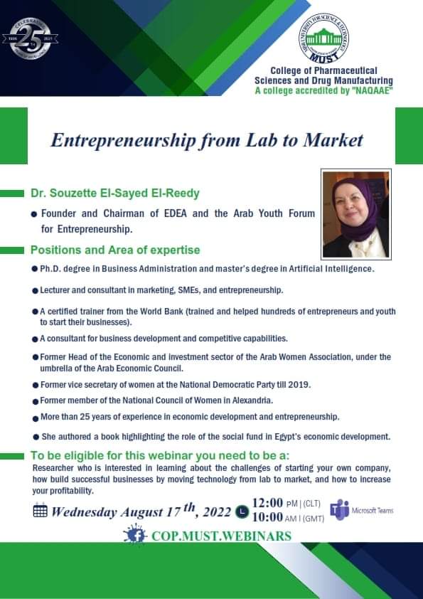 سيُعقد هذا الحدث المميز تحت رعاية السيد  الأستاذ/ خالد الطوخى، رئيس مجلس أمناء جامعة مصر للعلوم والتكنولوجيا، وأ. د/ نهاد محبوب، رئيس الجامعة وأ. د/ رحاب عبد المنعم، عميدة كلية العلوم الصيدلية والتصنيع الدوائى وأ. د/ مها عيسى، وكيل الكلية لشئون الدراسات العليا والبحث العلمي .