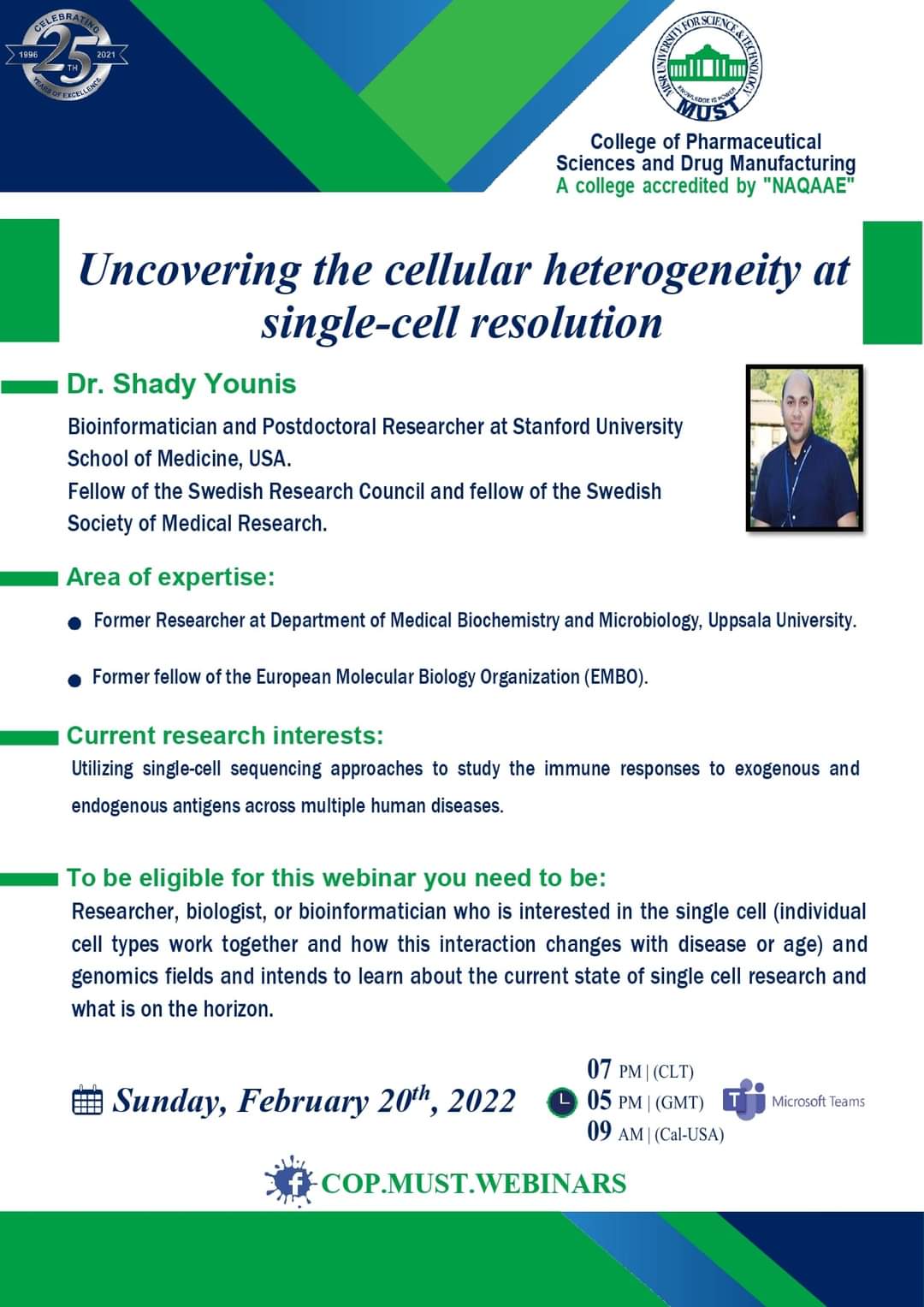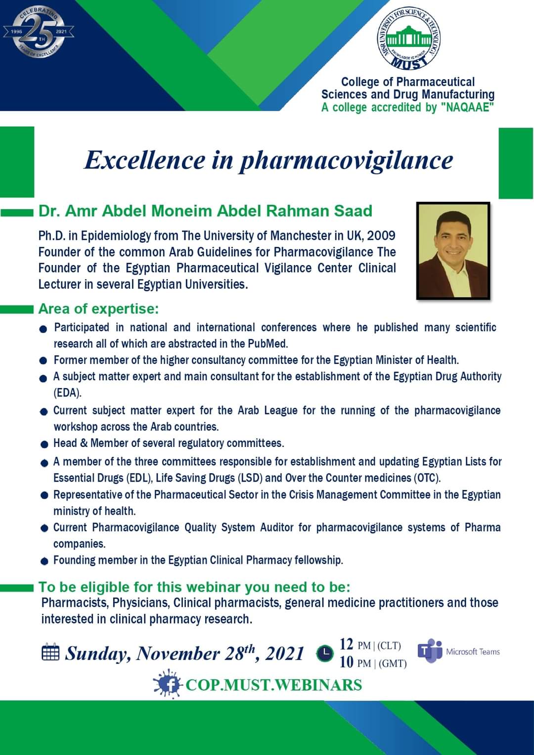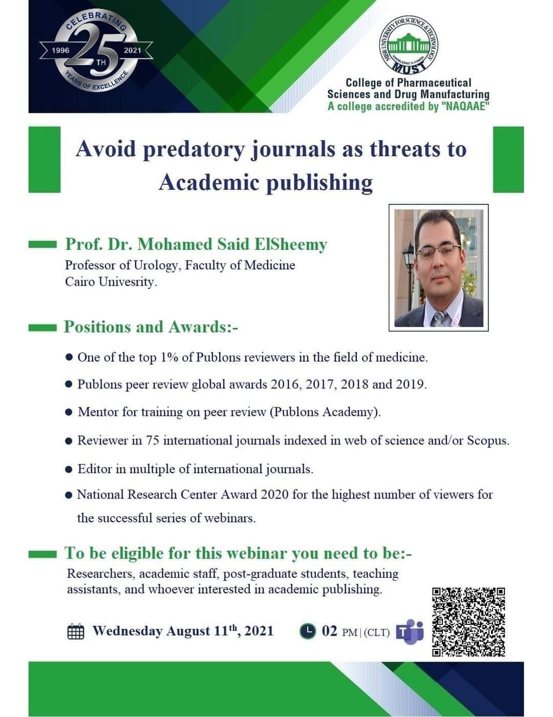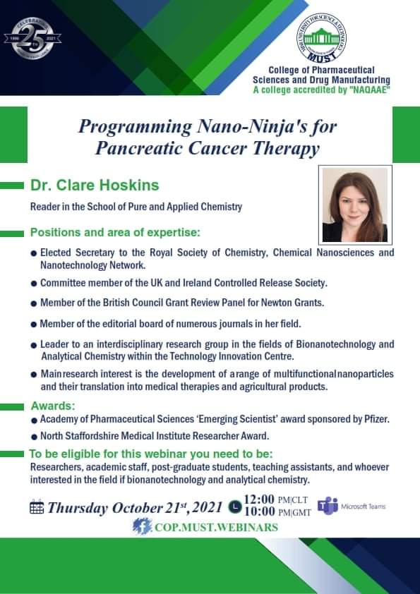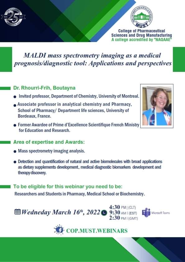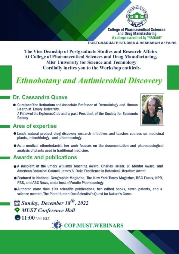 سيُعقد هذا الحدث المميز تحت رعاية السيد  الأستاذ/ خالد الطوخى، رئيس مجلس أمناء جامعة مصر للعلوم والتكنولوجيا، وأ. د/ نهاد محبوب، رئيس الجامعة وأ. د/ رحاب عبد المنعم، عميدة كلية العلوم الصيدلية والتصنيع الدوائى وأ. د/ مها عيسى، وكيل الكلية لشئون الدراسات العليا والبحث العلمي .