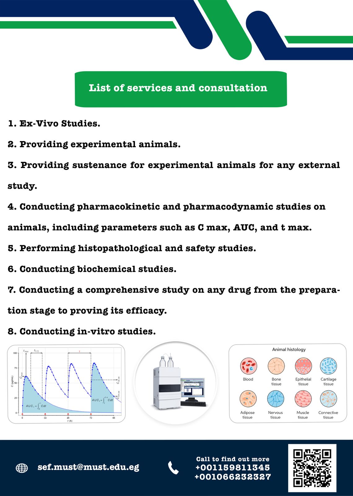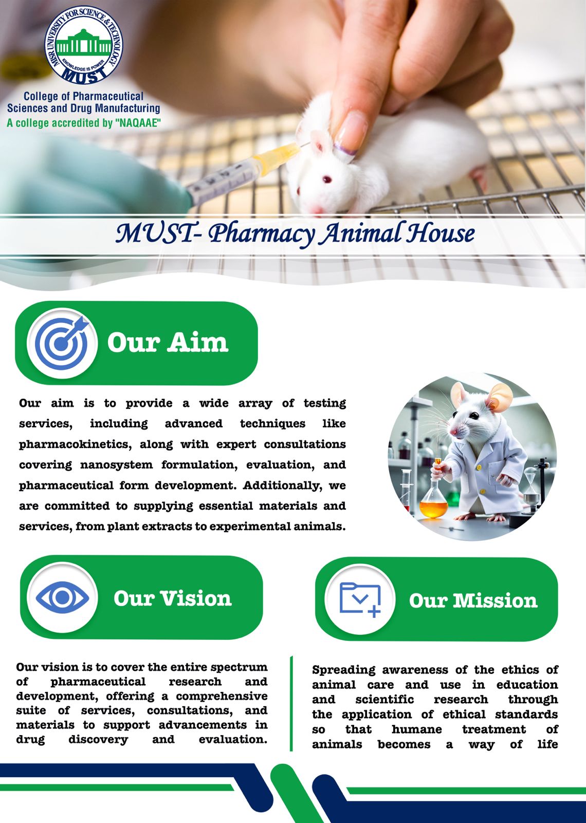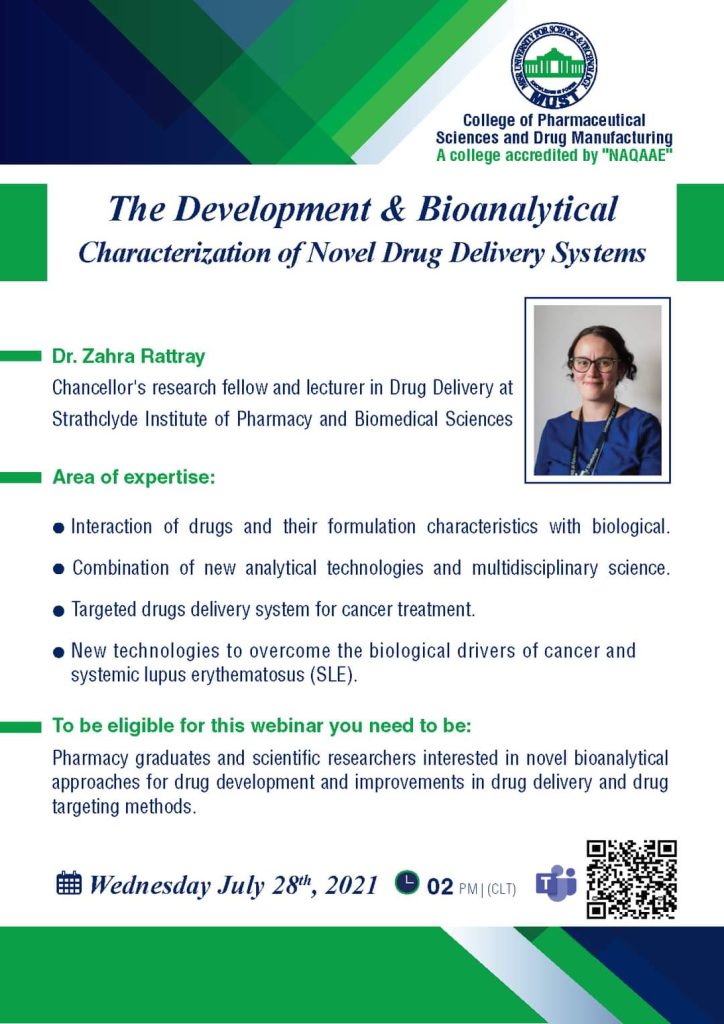 4. اجراء الابحاث العلمية المختلفه و التي تتماشي مع التطورالحالي في تخصص الصيدلانيات والتي تساعد علي حل المشكلات المتعلقه بانظمه توصيل الدواء بشكل امن و فعال