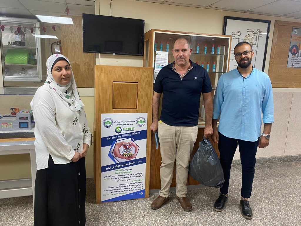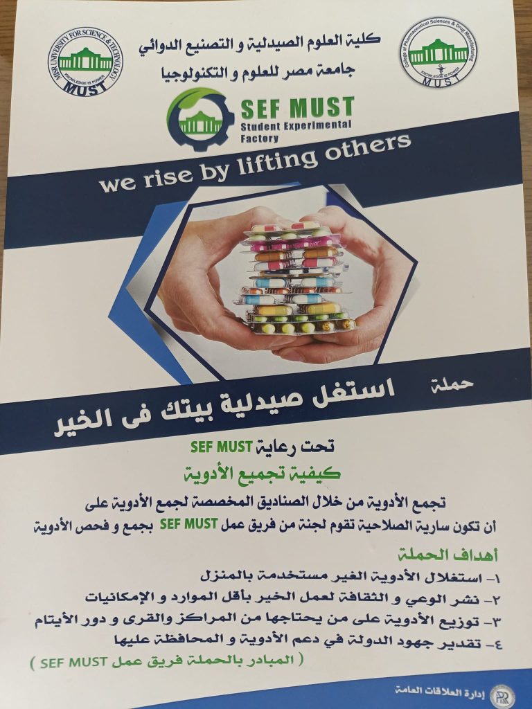 قامت لجان الخدمة المجتمعية بمشاركة فعالة والإعلان عن مبادرة استغل صيدلية بيتك في الخير، داخل وخارج الجامعة وفحص الأدوية للتأكد من سلامتها ثم توزيعها على المؤسسات الخيرية مثل مرسال ومؤسسة د. مصطفى محمود الخيرية  وضمان استدامة المبادرة من خلال حملات توعوية للطلاب والعاملين وتوريد هذه الأدوية بشكل دوري إلى كل من مؤسسة مرسال وجمعية مصطفى محمود الخيرية.