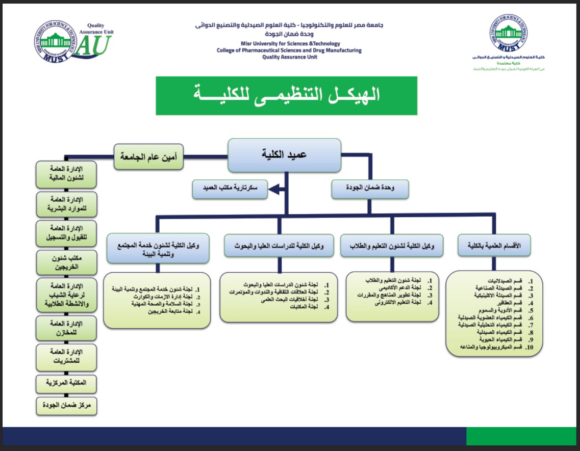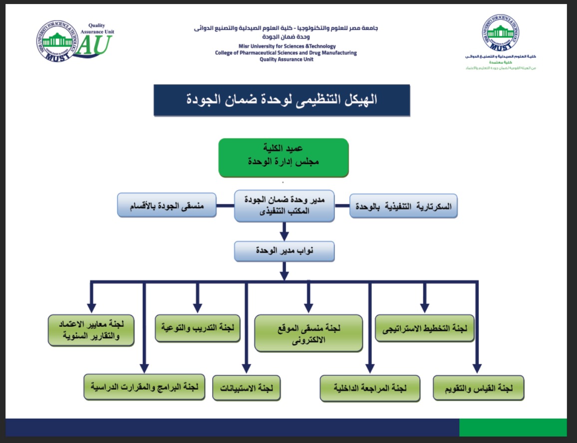فقد صدر قرار عميد كلية العلوم الصيدلية والتصنيع الدوائي رقم ١١ لسنة ٢٠٠٧ بتاریخ ۱۱-۱۱-٢۰۰۷ بتشكيل مجلس إدارة وحدة ضمان الجودة بكلية العلوم الصيدلية والتصنيع الدوائي جامعة مصر للعلوم والتكنولوجيا رقم ١٢ لسنة ٢٠٠٧ ، ثم القرار رقم ٤ لسنة ٢٠٠٩ ، وآخرها القرار رقم ٦ لسنة ٢٠١٠ ، كما تم تكليف مدير الوحدة ونائبه بالقرار رقم ٩ لسنة ٢٠١٠ في ۱۰-۱۰-۲۰۱۰ وتم تحديثه بالقرار رقم ٩ لسنة ٢٠١٣ بتاريخ ١-١٢-٢٠١٣م.