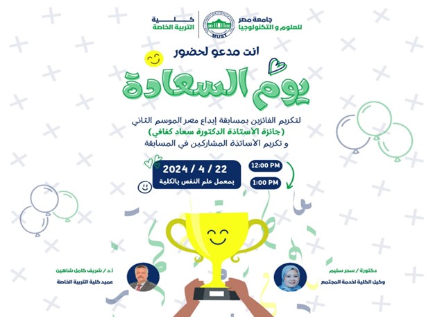 وسيتم تفعيل يوم السعادة ؛ يوم الإثنين الموافق 22/4/2024 من الساعة 12 – 1 مساءً، بتوقيت القاهرة، بقاعة (معمل علم النفس) كلية التربية الخاصة