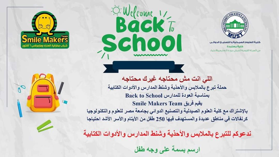 The College of Pharmaceutical Sciences and Drug Manufacturing has been invited to participate in the “Back to School” carnival, which includes a clothing exhibition benefiting underprivileged families and their children. This event is organized by the Smile Makers Team in collaboration with the college for the fourth consecutive year. It will take place on Friday, September 20, 2024, at the “Together to Save a Human” Foundation at 5:00 PM. In-kind donations are accepted through the Dean’s office, including clothing, shoes, school supplies, and school bags