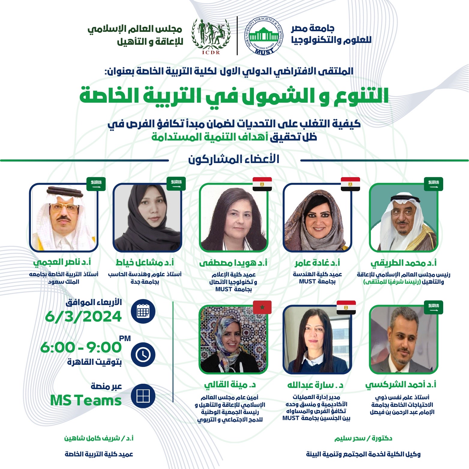 the Community Service and Environmental Development Sector at the college has the honor to invite you to attend the first international virtual forum of the College of Special Education (MUST), titled “Diversity and Inclusion in Special Education,” which aims to achieve these sustainable development goals: the principle of equal opportunities for persons with disabilities in the fields of education, employment, technology, and social participation.