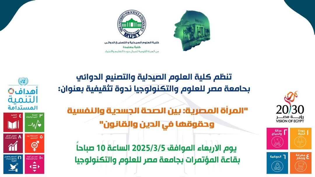 As part of the initiative “The Future of Egyptian Women: Daughter, Mother, Grandmother” for the fourth consecutive year, the College of Pharmaceutical Sciences and Drug Manufacturing invites you to attend our educational symposium titled “Egyptian Women: Between Physical and Mental Health and Their Rights in Religion and Law.”