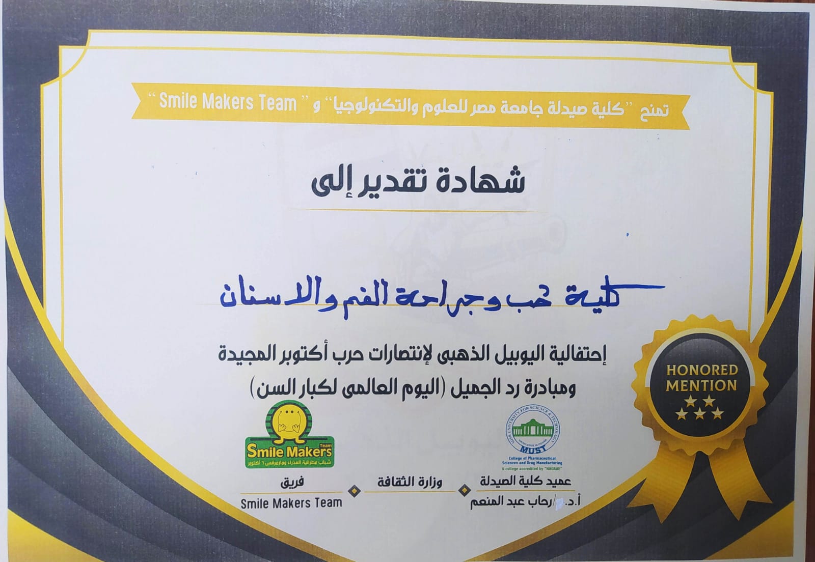 With the approaching of the 1st of October, which was designated by the United Nations as International Day for old people within the framework of fulfilling the promises of the Universal Declaration of Human Rights regarding the elderly across generations, the Medical Convoy Committee was commissioned by the Dean of the College, Prof. Hala El Menoufi and Prof. Hassan Al-Shami, Vice Dean of the College for Community Service and Environmental Affairs. On Friday, September 29th, 2023, Misr University of Science and Technology announced that the faculties of the medical sector, represented by the College of Medicine, the College of Oral and Dental Surgery, the College of Pharmacy, and the College of Physiotherapy, would be welcoming the elderly to provide them with health care by each college according to its specializations for the elderly. The College of Oral and Dental Surgery representatives, who were present at the meeting activities, explained the college readiness in its various departments to receive this valuable segment of our elderly citizens, who gave so much to their country, and the time has come to return their favor. Not only on October 1st, but every Sunday and Thursday at noon in the diagnostic clinic on the first floor of the college; this is in preparation for distributing them to the college specialized clinics to diagnose and treat various cases of dislocations, fixed and removable prosthetics, fillings, root canal, gum treatment, and others. May God protect them all from the evil of diseases and grant them good health.